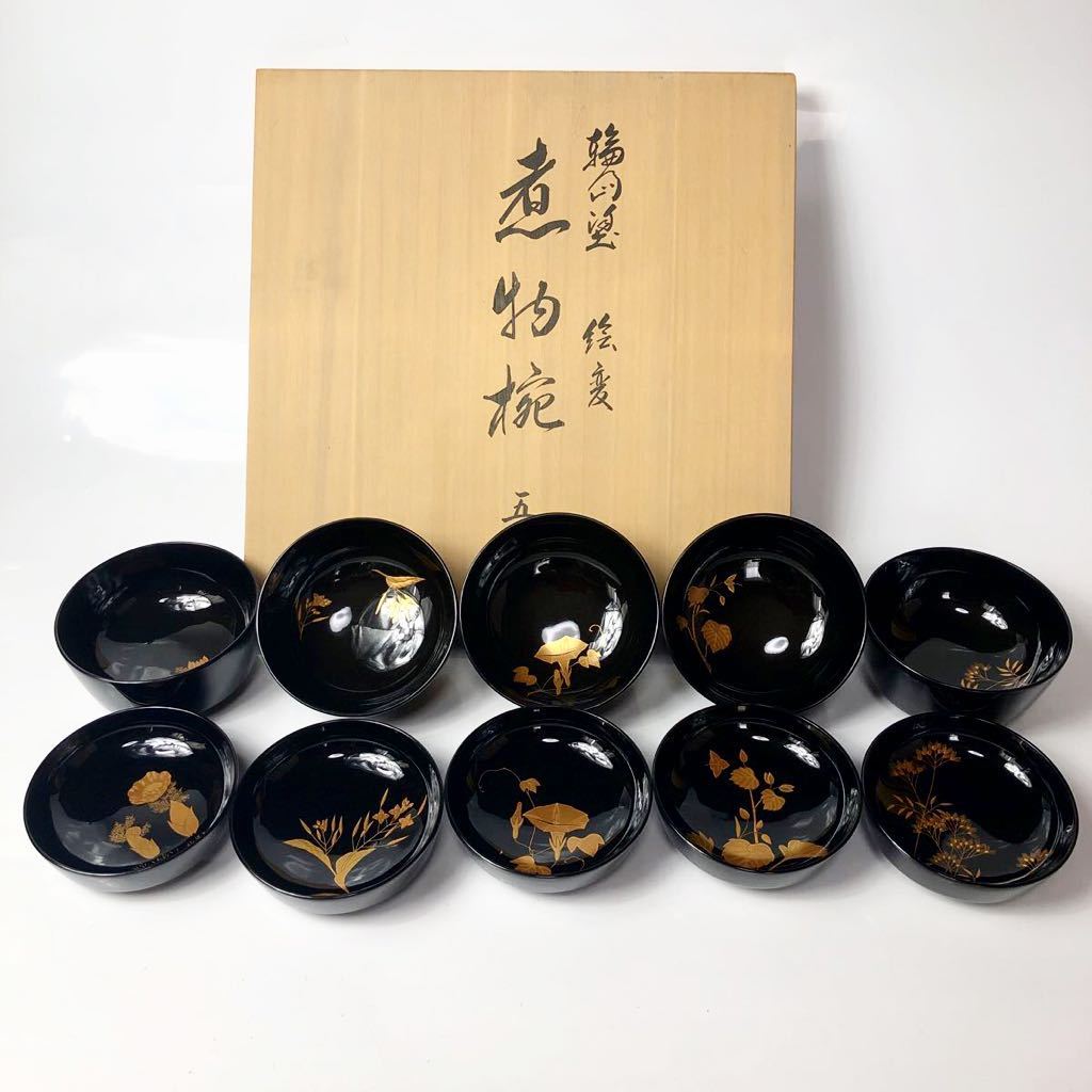 - ★ 輪島塗 坂一男 作 真塗 蒔絵 絵変り 煮物椀 5客(共箱共栞)漆器 椀 懐石料理 お料理屋さんの器