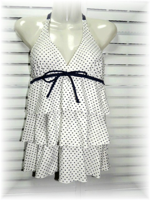 - ティアードフリルタンキニ セパレトー水着 9号/M ホワイト×ネイビー水玉