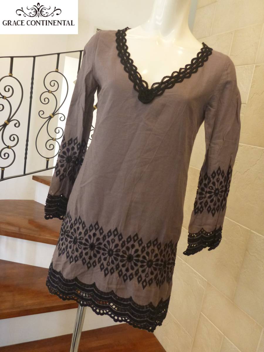 - 3.5万 美品 GRACE CONTINENTAL グレースコンチネンタル ★黒刺繍×ブラウン系 チュニック丈 ブラウス 36 S相当
