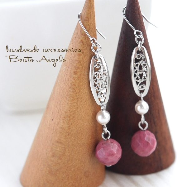 > ◆◆+angelo+天然石シリシャスシストとオーバル透かしのピアス(p-016)G ピンク チタン 樹脂 イヤリング