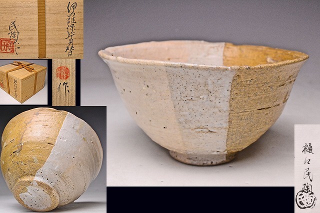 > 樋口民陶 ★ 伊羅保 片身替 茶碗 ★ 共箱 栞 ★ 李朝写しの名工 ★ 茶道具 ★ 検 出雲焼 楽山焼 ★