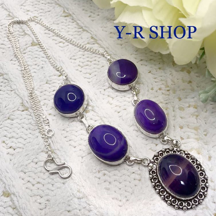 - 天然石★艶々パープルアゲートのアンティーク調ネックレス★レディースペンダントシルバー 925刻印エスニックインドジュエリー新品宝石