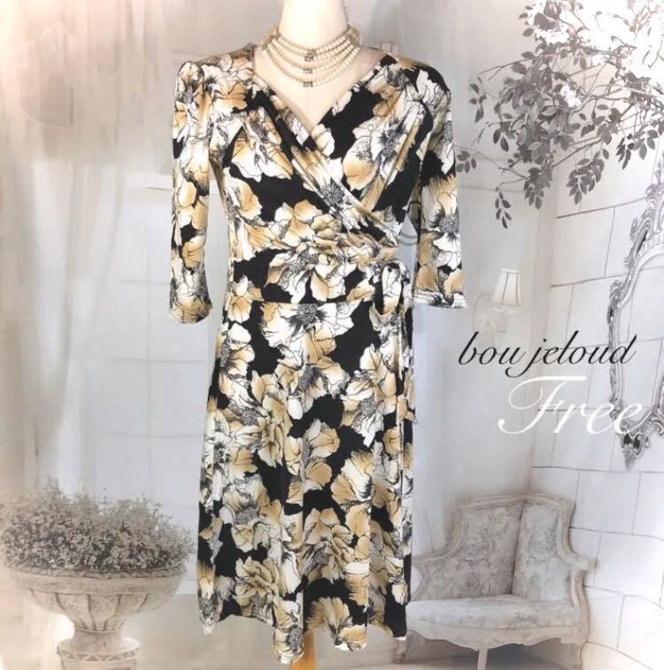 - 美品 bou jeloud ブラックライトブラウン ボタニカルワンピース フリーサイズ 秋冬