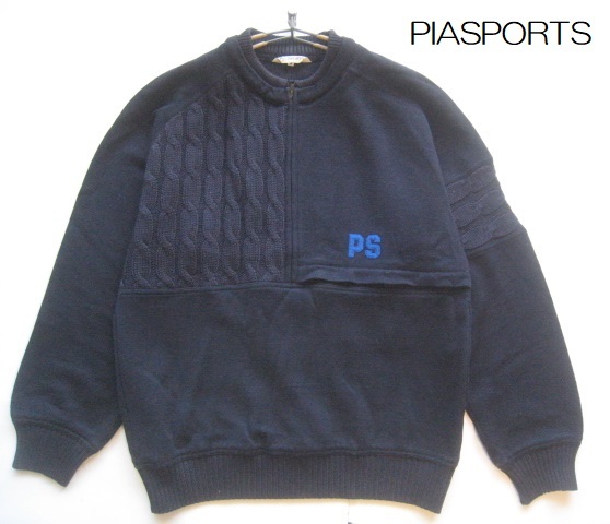 - 高級日本製!!ピアスポーツ PIASPORTS*ロゴワッペン付き ケーブル編みニット切り替えハーフジップスウェット 3 実寸M 紺 ライカ RAIKA