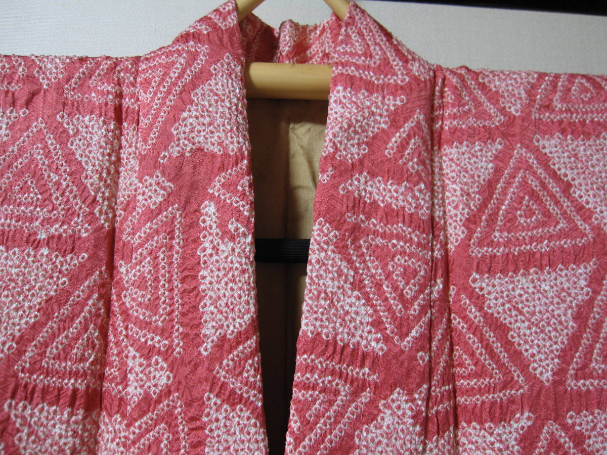 - 小紋 総絞り小紋 ローズ系色 上質素材。裄64袖丈57(長め)。*胴裏シミあり。人形用材料、小物づくり、リメイク 色無地 名古屋帯