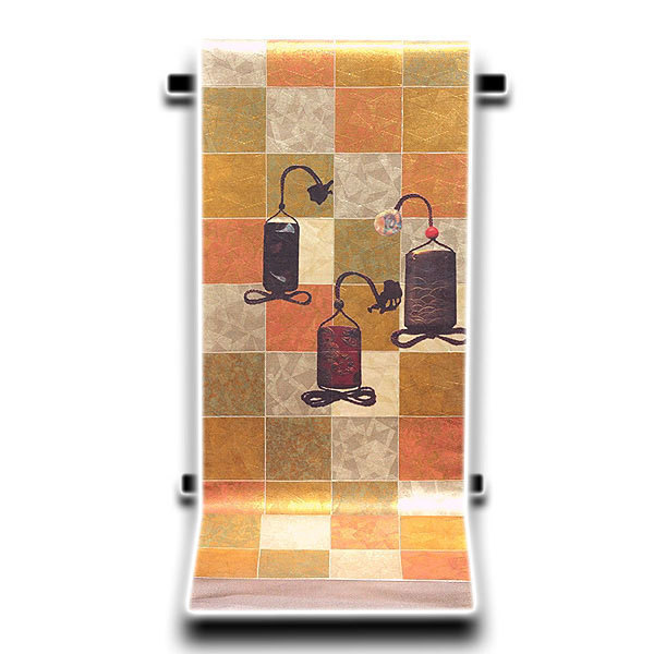> [和楽屋] ■市松模様に印籠柄 太鼓柄 正絹 袋帯■