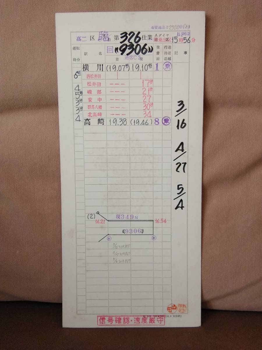 - 動力車乗務員運転時刻表 スタフ 高崎第二機関区 第326仕業 回9306レ 横川ー高崎 EF62