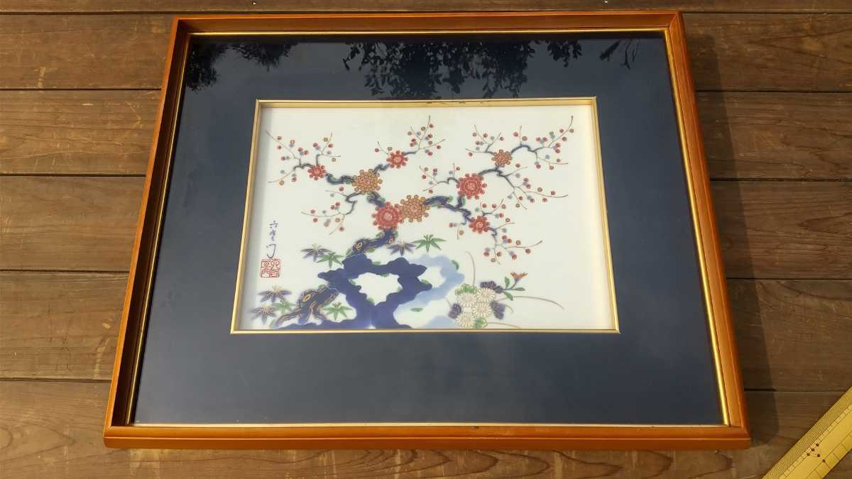 - 深川製磁 陶額 陶板画 岩梅に菊と笹 右衛門銘 陶額サイズ(縦37㌢横47㌢高さ5㌢重さ2.6㌔)