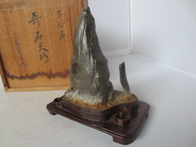 - 【艸】 古谷石 石友斉百穂 水石 佐治川石 唐木台座 石置物 時代石 奇岩石 共箱付き 18ap2