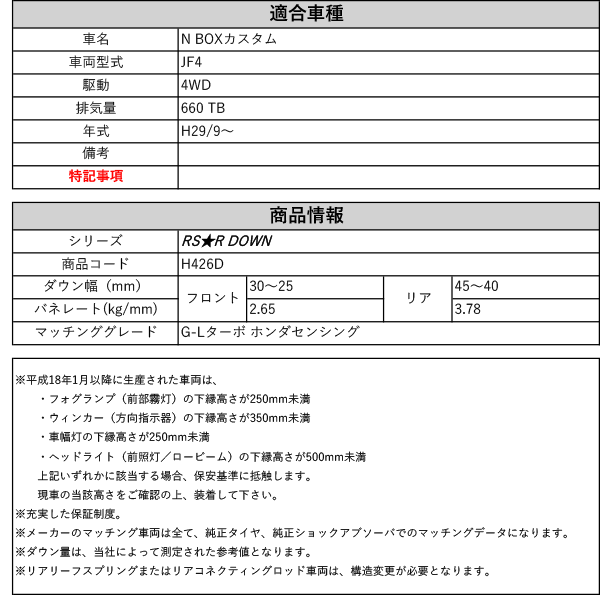 > [RS-R_RS★R DOWN]JF4 N BOXカスタム_G-Lターボ ホンダセンシング(4WD_660 TB_H29/9~)用車検対応ダウンサス[H426D]