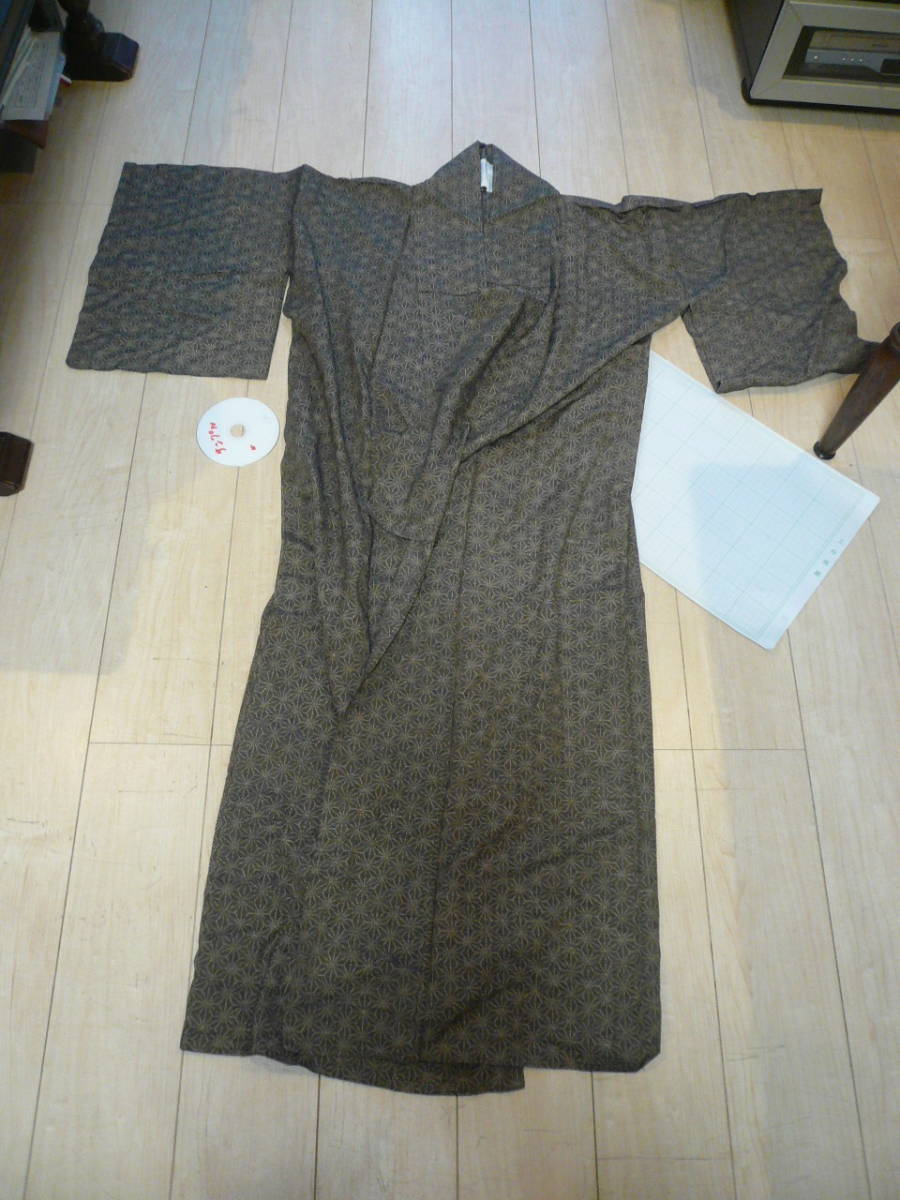 > AC即決 KIMONO 着物 小紋 ひとえ 麻の葉模様 グレイ灰色 和柄古典 レトロ クラシック 着物 和装 送料600円~