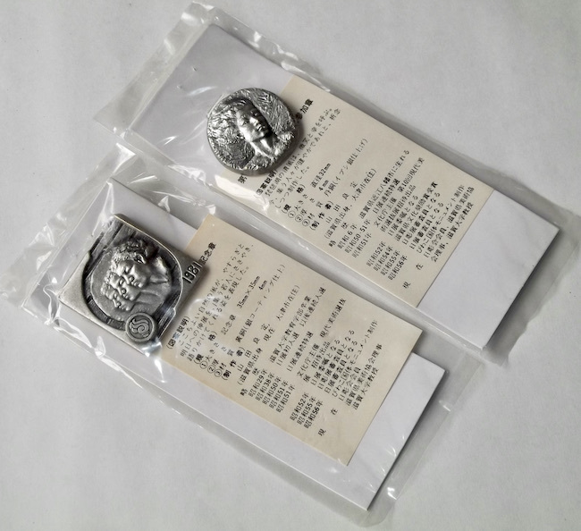 - 80年代 体育大会 ブローチ 2点 山田良定 彫像 国体 身体障害者スポーツ大会 滋賀県 黄銅 丹銅 銀メッキ 記念品