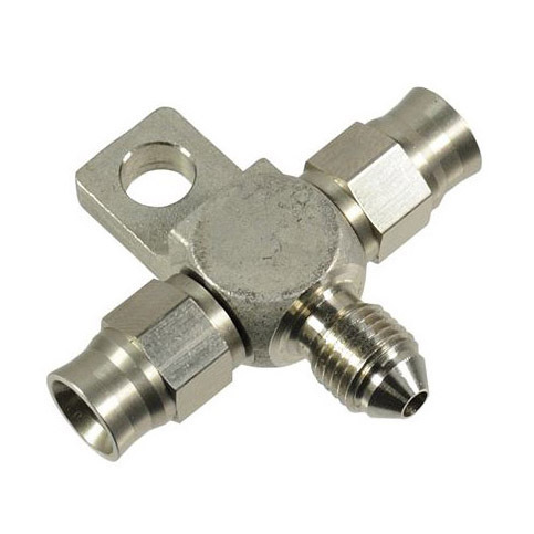 - ステンレス製 3ウェイ T型 ブレーキホースエンド マウント付き AN3メス-オス-メス