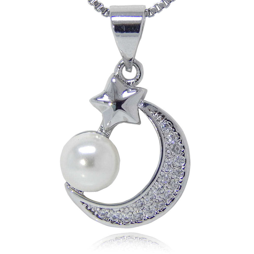 > 残り1点★新品★送料無料 月と星 淡水真珠 18連CZダイヤモンドネックレス シルバー925 プラチナ仕上 レディースアクセサリー ジルコニア