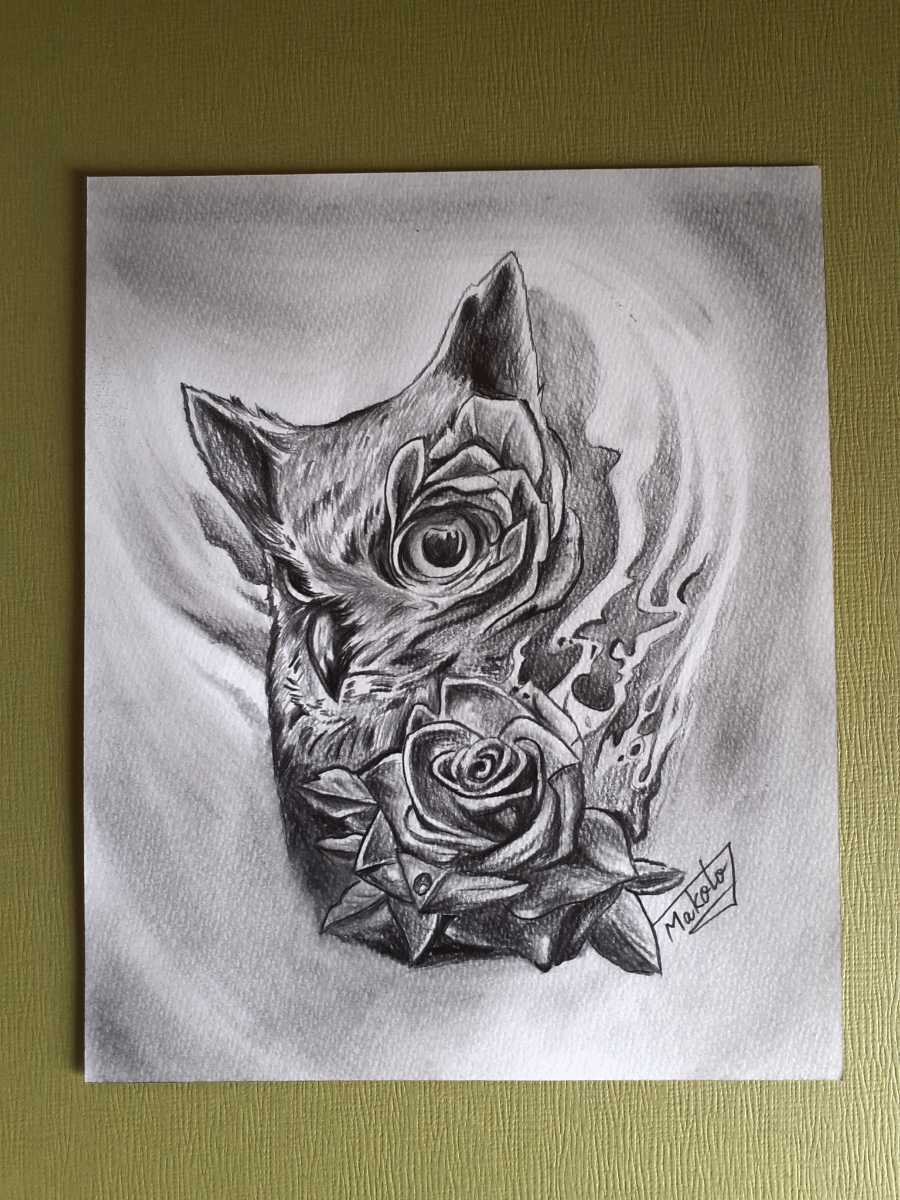 - 鉛筆画アート フクロウとバラのコラボ