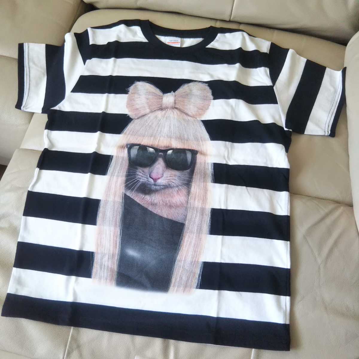 > 新品 ペッツロック Tシャツ レディーガガ レディー・ガガ レディース M 半袖 ボーダー ストライプ 白黒 モノトーン 猫 ネコ ねこ 柄 グッズ