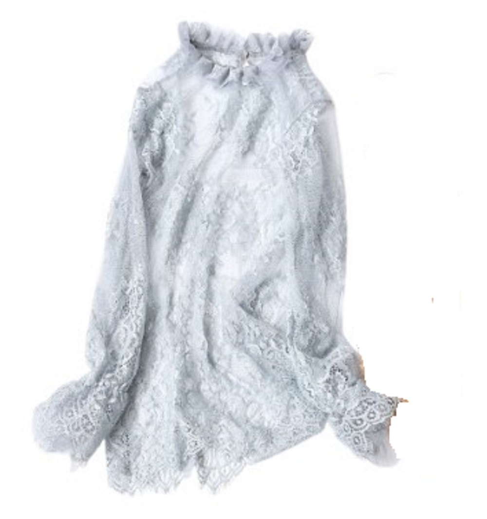- 新品●送料無料●フレアー袖の スタンド2枚襟 総レース トップス 【グレー】