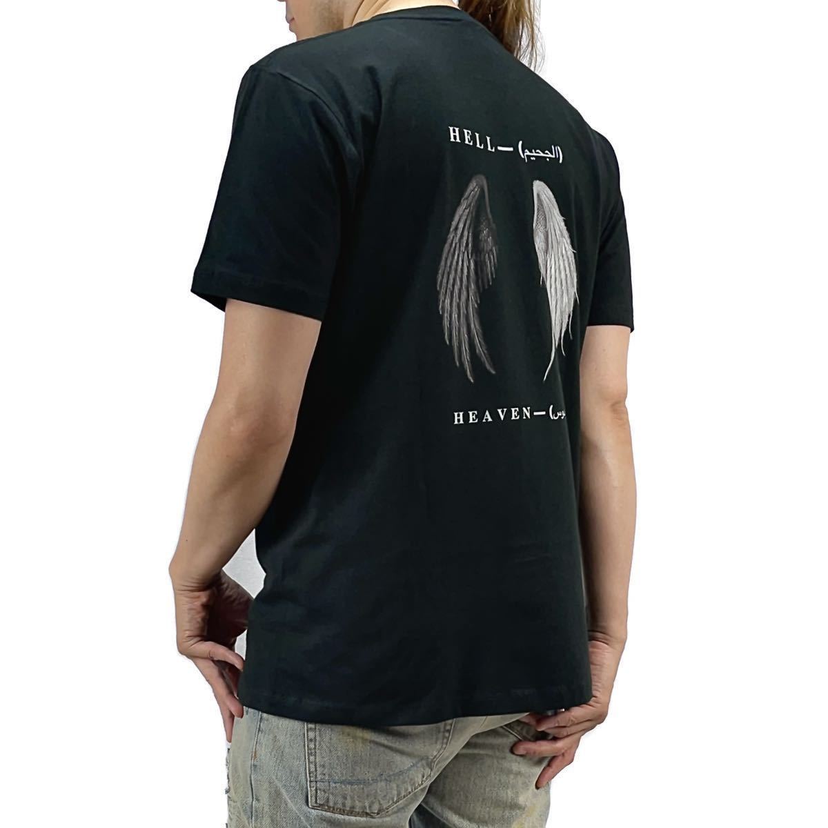 > 新品 天国と地獄 天使と悪魔 エンジェル&デビル ウイング 羽根 翼 アラビア文字 バックプリントTシャツ Lサイズ UNI 男女兼用 ユニセックス