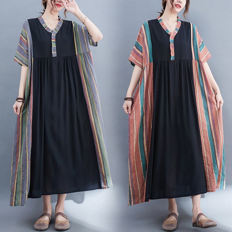 - ZJM976 相当ボーダー切り替えゆったり大きいサイズ*半袖ロングワンピース 新品春夏*レディース*カジュアル*体型カバー*3L4L