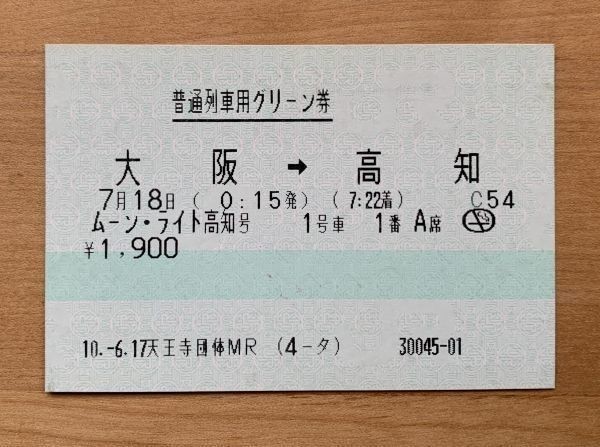 - 切符 マルス券1 快速 ムーンライト高知 普通列車用グリーン券 大阪→高知 平成10年 No.30045-01 天王寺団体MR