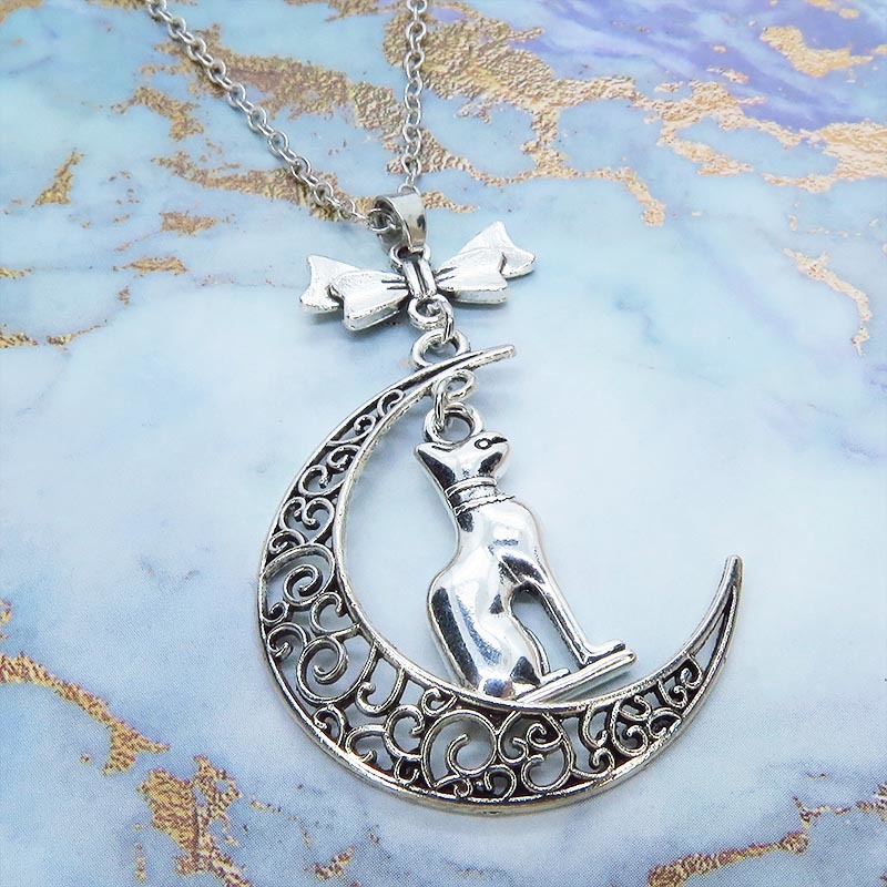 - 猫の神様 アンティークシルバーのバステト神と透かし三日月の大人可愛いネックレス ムーン リボン アジャスター付