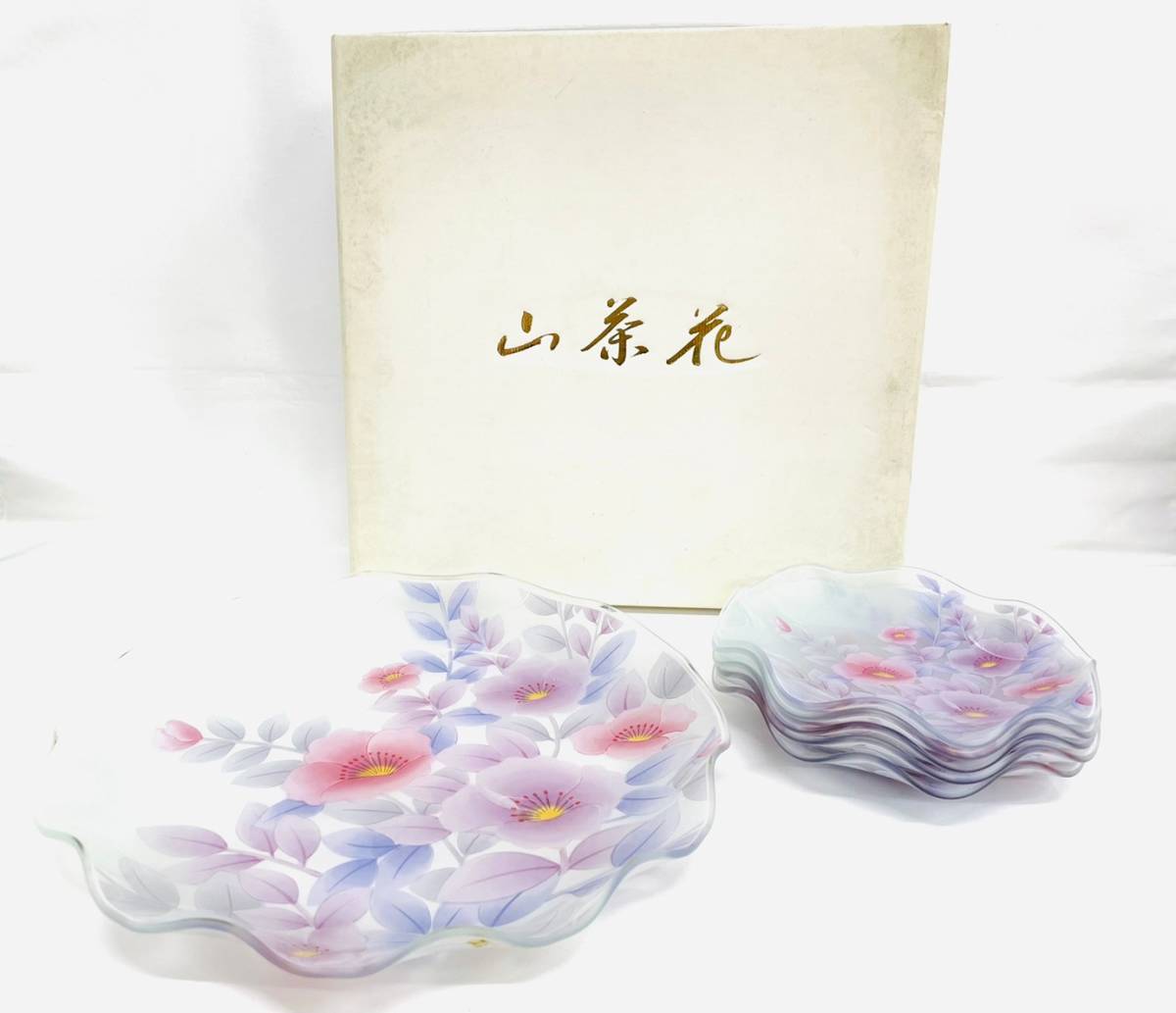 - 14006*0.5 山茶花 花柄 大皿×1点 取り分け皿×5点 6点セット 食器 箱付き