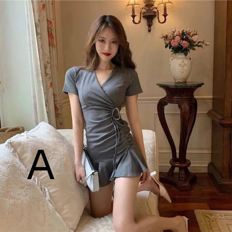 > ZJM1621 裾フレア シャーリング仕様 伸縮性有りセクシー タイトワンピース ぴったりボディラインVネック カシュクール