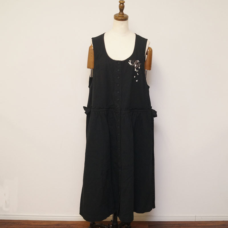 > ym92-PINKHOUSE ピンクハウス ワンピース ブラック キャンバス ジャンパースカート ロゴ 小花 刺繍 ロング