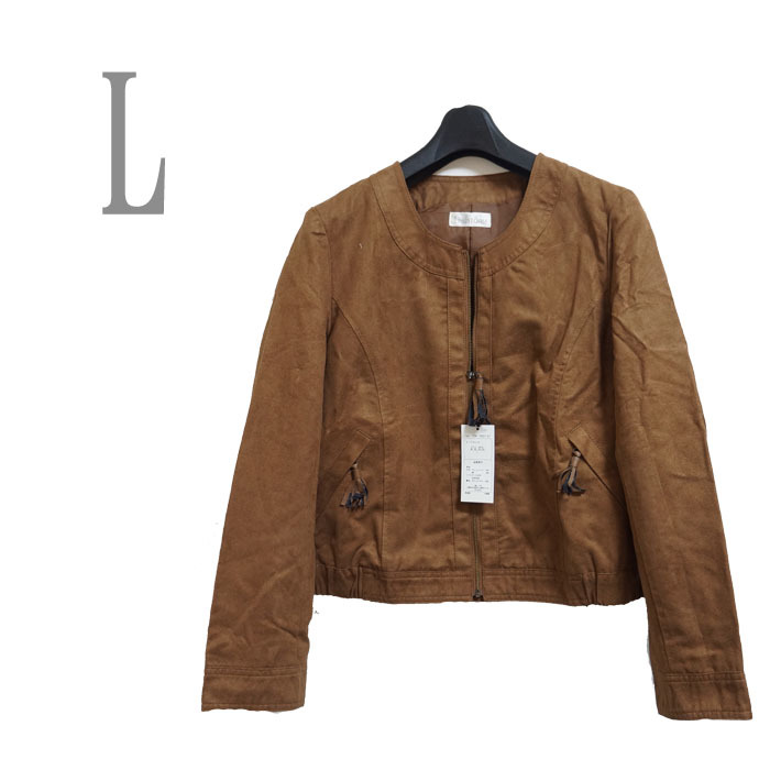 > ●新品/フェイクレザー/ジャケット/ブラウン系/L/フリンジ/ノーカラー/レディース●い0409