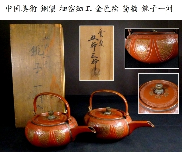 【 恵 #0043 】 中国美術 銅製 細密細工 金色絵 菊摘 銚子 一対拍卖