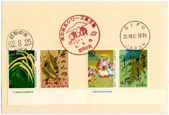 > ★絵入りハト印付ハガキ−28:1987 奥の細道シリーズ第3集 栗の花と早苗 耳紙付★(16.05.26)