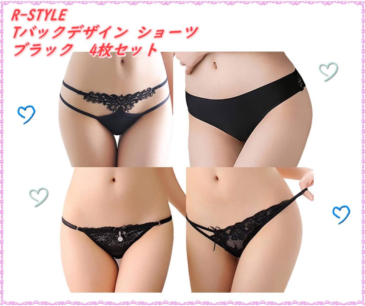 - R-STYLE セクシー 魅力的 Tバックデザイン ブラックレディース ショーツ 4枚セット (typeB)