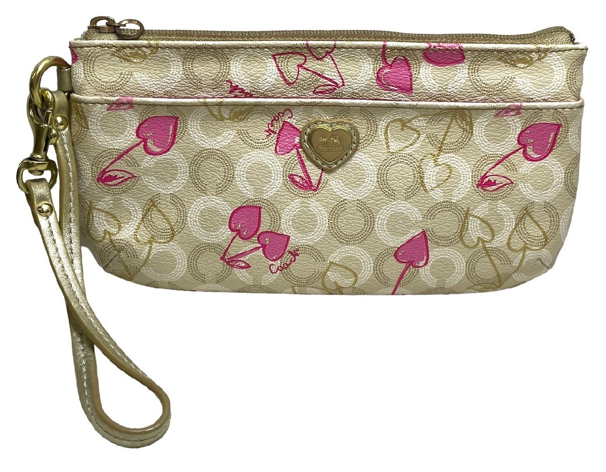 > コーチ 長財布 リストレット ポーチ ストラップ付 財布 オプアート ハート チェリー COACH PVC ベージュ ピンク レディース 【中古】