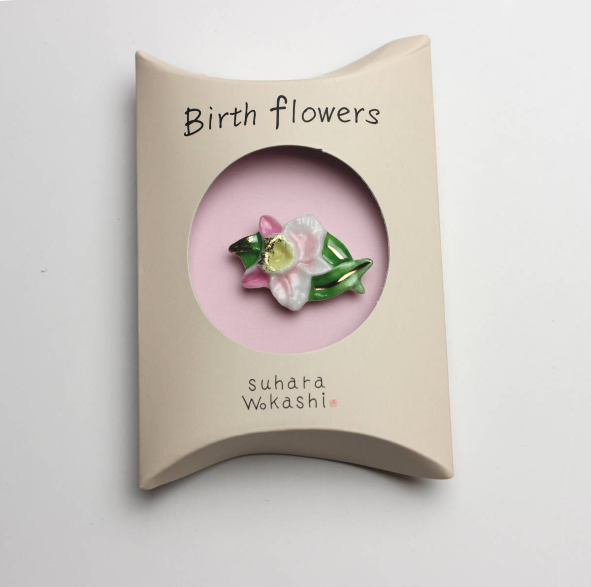 > 陶器製 誕生花 ピンブローチ 12月 カトレア【新品 未使用 ケース入り】日本製 瀬戸焼 洋ラン ラペルピン ピンバッジ すはらをかし せともの