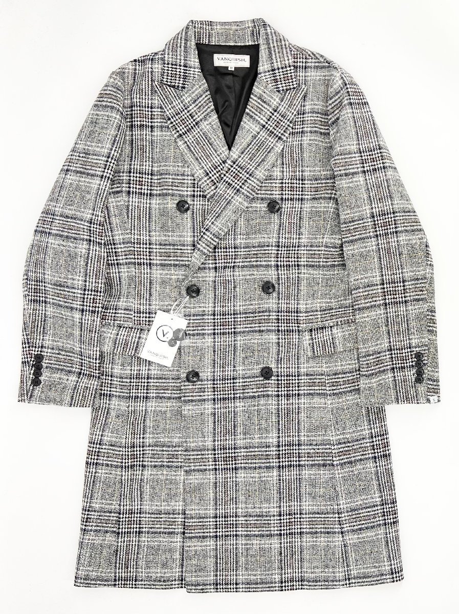 - 未使用品 VANQUISH ヴァンキッシュ 「Hounds-tooth Check ダブル チェスター コート」 グレンチェック柄 ウール調 M グレー 定価¥24,200-