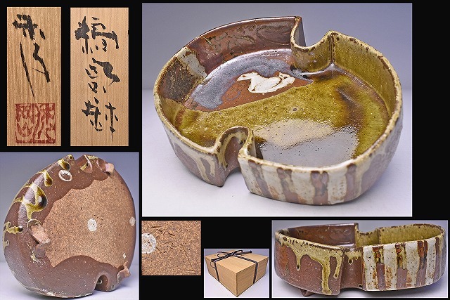 > 高内秀剛 ★ 織部 鉢 ★ 共箱 ★ 独特の造形美に深味のある緑遊が美しい逸品 ★ 手付鉢 菓子鉢 ★ 食器 茶道具 ★