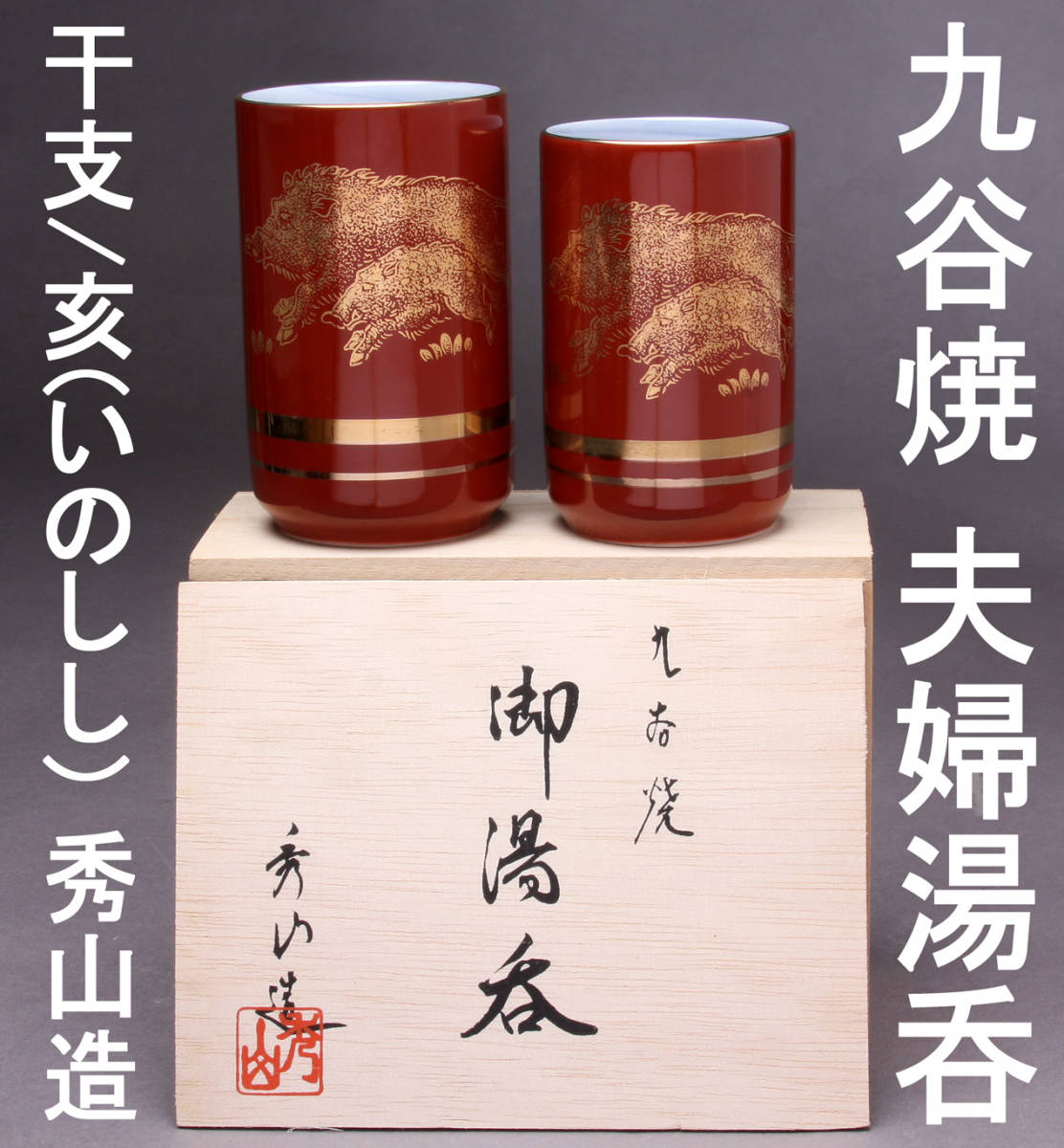 - 九谷焼 夫婦湯呑 干支 亥年 イノシシ年 秀山造 経年保管品 箱付き KA-7485