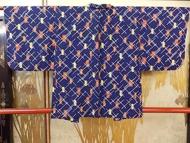 - きもの今昔4621 お羽織コレクション 染ウールおしゃれ羽織 紺色地 羽織身丈77cm