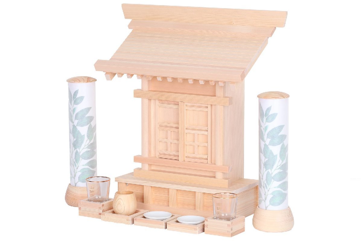 - 神棚 セット モダン 美・木曽ひのき 特上 一社 唐戸扉 神具付き 榊灯 さかきあかり 桧の神具セット