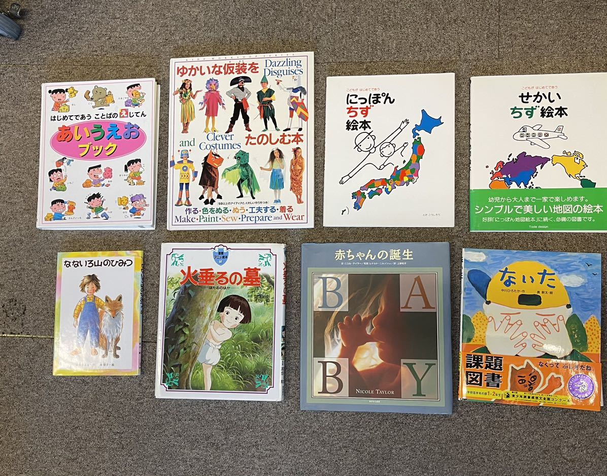 - 絵本 あいうえおブック 愉快な仮装 にっぽんちず せかいちず 火垂るの墓 赤ちゃんの誕生 ないた なないろ山のひみつ 8冊