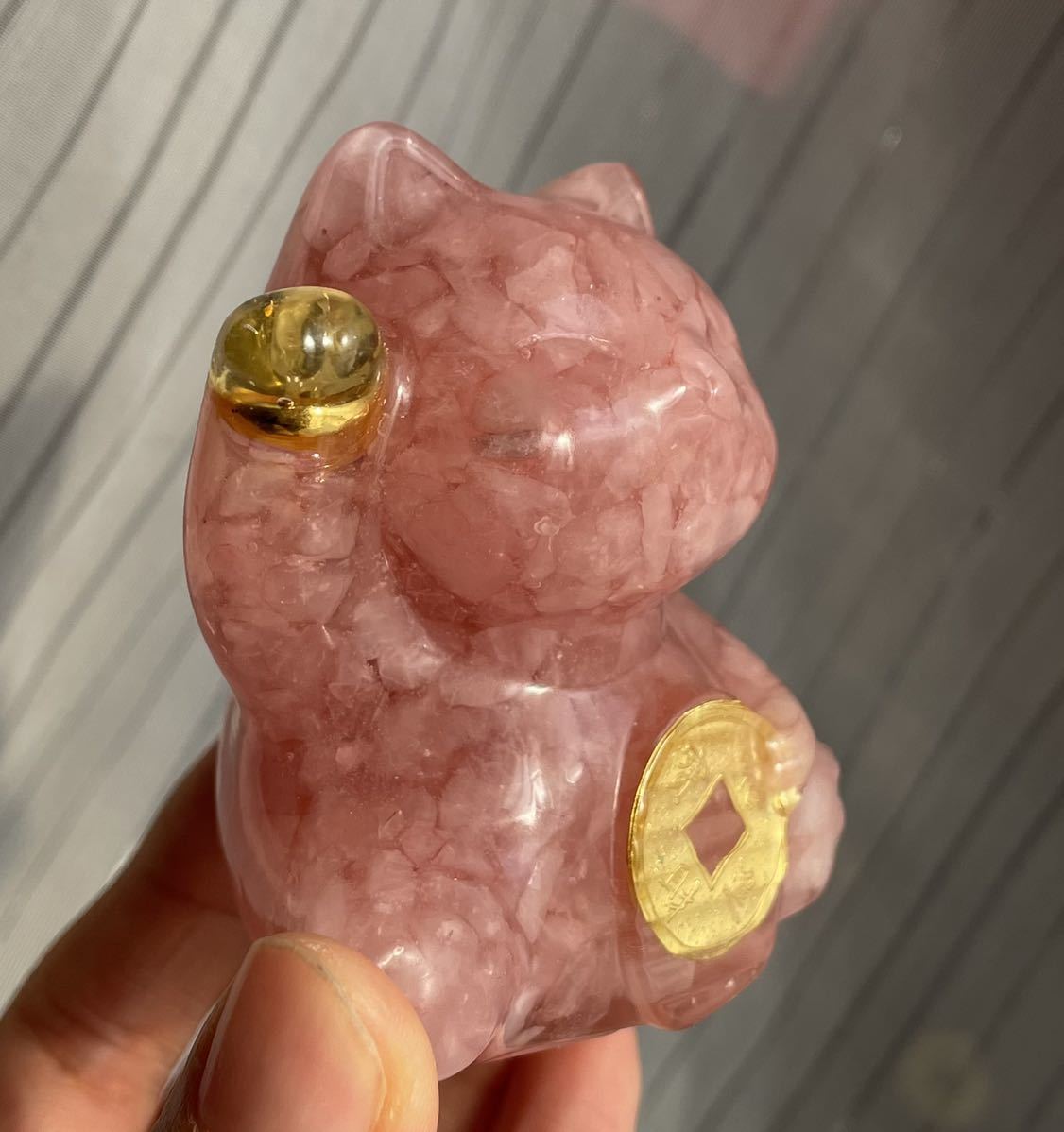 > 招き猫 オルゴナイト ローズクォーツ パワーストーン ラッキー 開運 幸運 置物インテリア 天然石 魔除 お守 風水晶 クリスタル 恋愛運UP