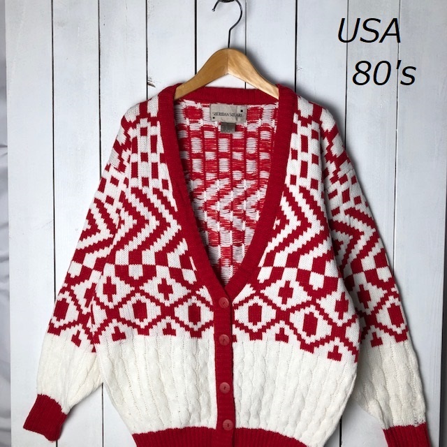 - USA古着 80s USA製 切替え ジャガード×ケーブルニットカーディガン M~L 白×赤 オールド ヴィンテージ アクリルニット 幾何学模様 ●199