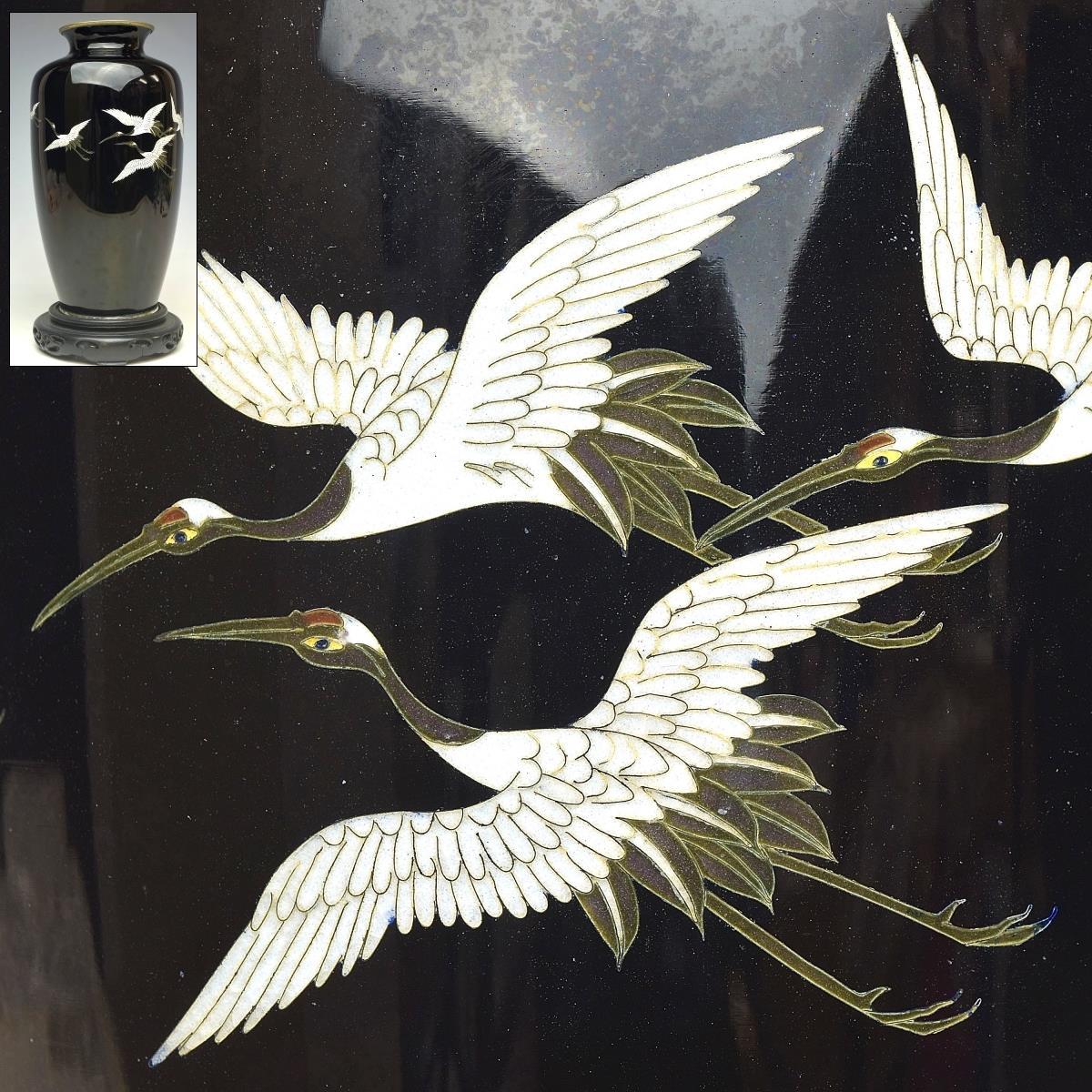 - 【趣楽】 明治時代 銀線飛鶴図七宝花瓶 台付 本体高さ24,5cm 重量1050g P1801