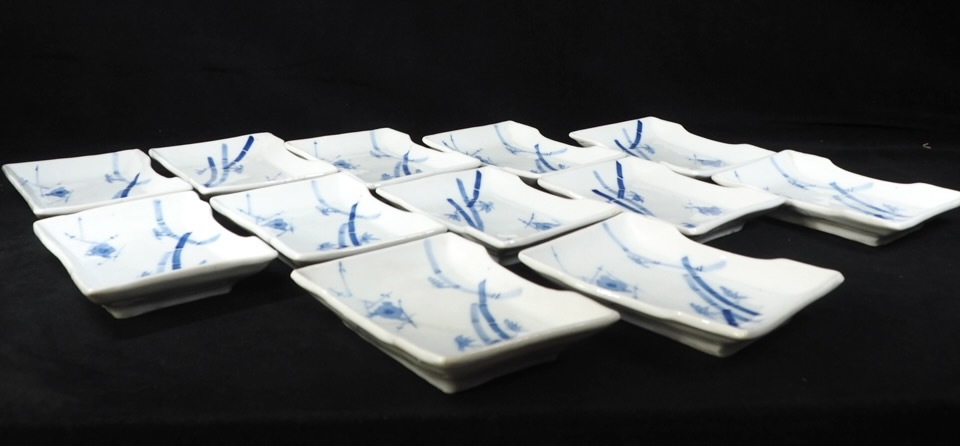 - 昭和ビンテージ 在銘 染付松竹梅文角皿一二客揃え 幅15.5cm 縦11cm 高さ2.5cm TAK501