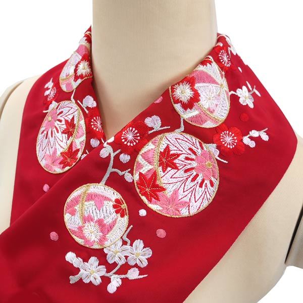 - 刺繍半衿 赤色 つけ衿 古典 手毬 花柄 he-413 振袖 成人式 結婚式 卒業式 袴 訪問着 洗える