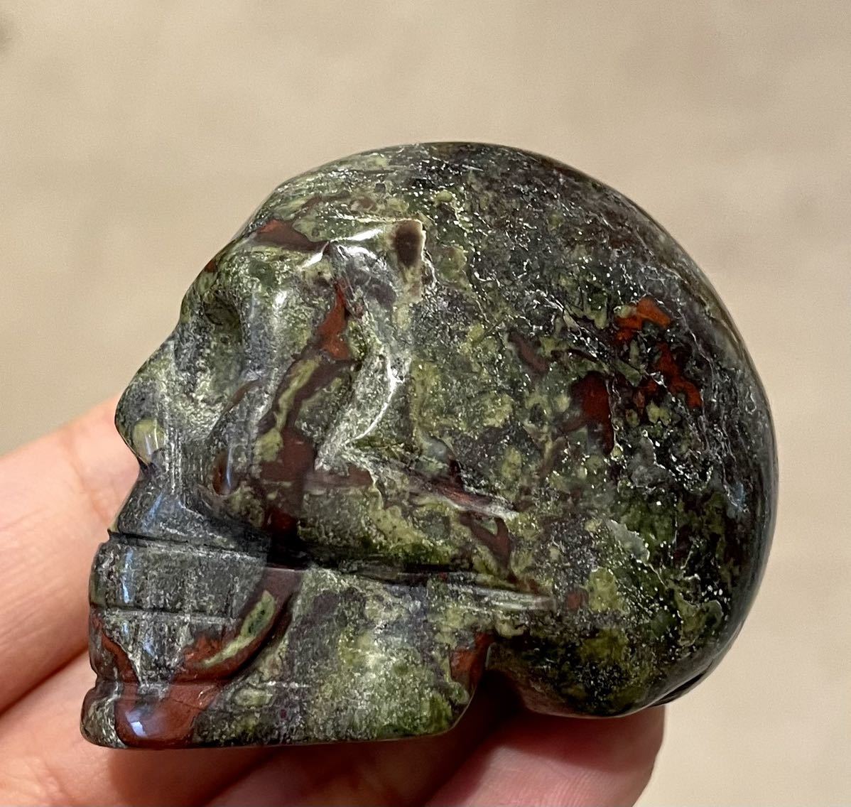 - ドラゴンジャスパー スカル 髑髏 骸骨 幸運 ラッキー パワーストーン 天然石 置物インテリア グリーン 魔除 お守 開運 小物グッズ