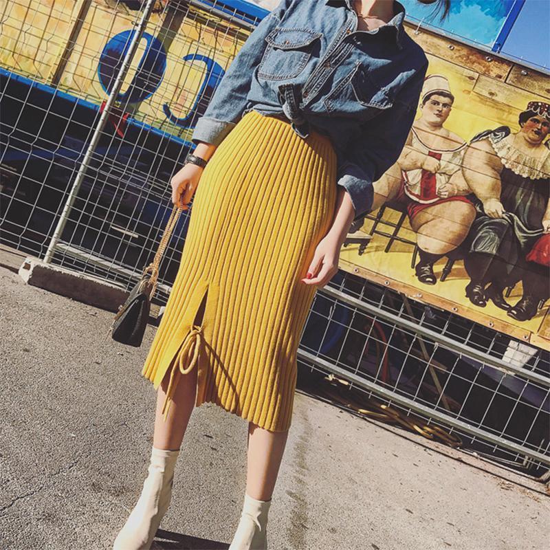 - イエローレディース ニット ペンシル スカート タイト スカート ロング丈