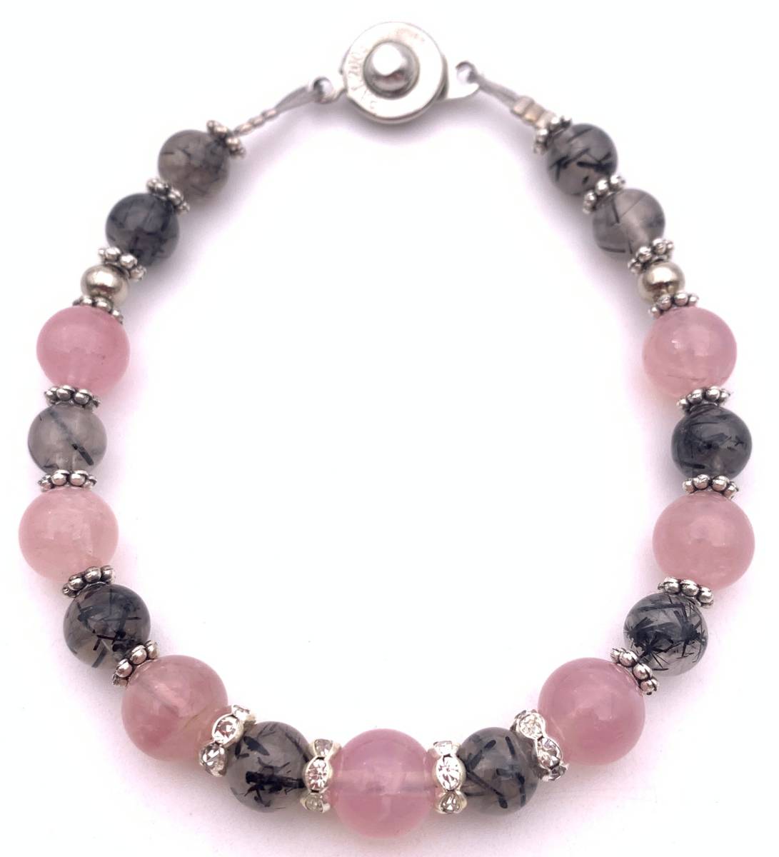 - 天然石マダガスカル産ディープローズクォーツ&ブラックルチルクォーツのブレスレット