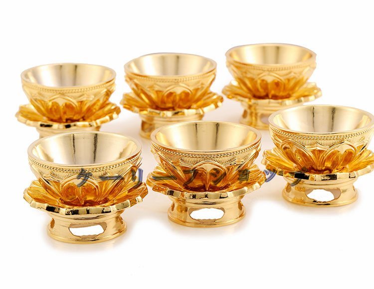 - 【ケーリーフショップ】仏教密教 法具 職人手作り 真言宗 真鍮製花器 蓮花型 金メッキ 仏具 蓮花六供杯 6点セット