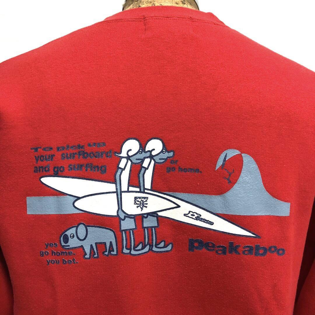 > M 良品 PEAKABOO 赤 スウェット 両面プリント トレーナー ピーカブー オールドサーフ ビンテージ 古着 90s surf サーフィン